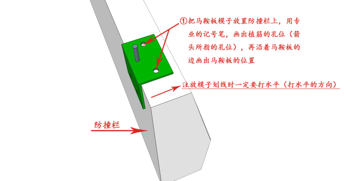 ①把馬鞍板模子放置防撞欄上,用專業的記號筆,畫出植筋的孔位(箭頭所指的孔位),再沿著馬鞍板的邊畫出馬鞍板的位置 ②依次按照2500mm(如圖所示)的間隔做好標記 ③按照放樣的孔線位置把植筋打進去,一定要對準位置打孔 ④將立柱(立柱和馬鞍板在工廠以焊接完成)放置防撞墻上,注意將立柱植筋孔套在打下的植筋中,將立柱扶好調整好位置......