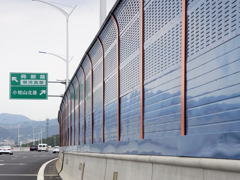 高速路金屬隔音墻由隔離箱、連結件和緊固件構成。隔音箱由π形箱體、百葉窗面板、填充吸音材料及上下兩端的封頭構成。高速公路上的噪音大部分由百葉窗進入,被吸音填充材料吸收,故高速公路自城區穿過也能達到噪音環保要求的指標。隔音墻的面板、箱體采取防銹措施,使其美觀、耐用。