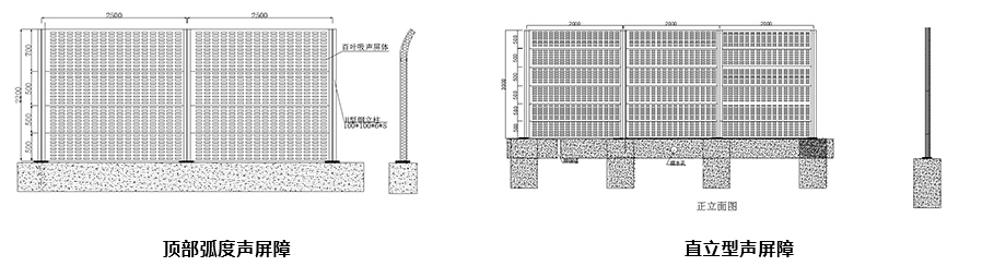 頂部弧形聲屏障適用于各種條件下,比較常見。這種聲屏障一般用頂部500mm的高度做成小弧形,其余下部分高度采用直立樣式。